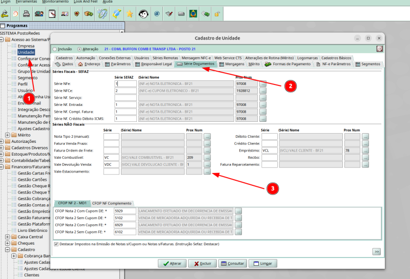 - No cadastro das unidades que irão gerar os vales, aquelas que operam com o SigaPark, a série para emissão do vale.