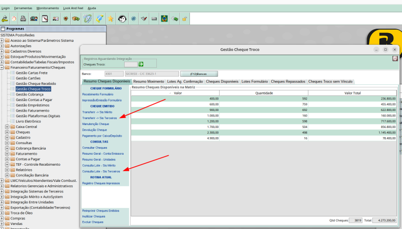 Criada rotina para transferência de cheques-troco para postos que não utilizem o Sistema Pista da Mérito conforme imagem abaixo. | Criada rotina para transferência de cheques-troco para postos que não utilizem o Sistema Pista da Mérito conforme imagem abaixo. | ||