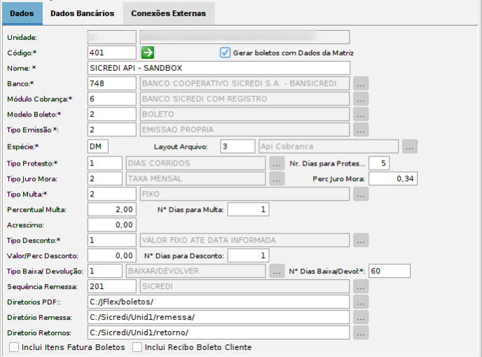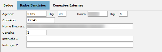- Aba Dados Bancários: Configuração de dados como agência, conta, convênio, necessárias para o funcionamento das rotinas.